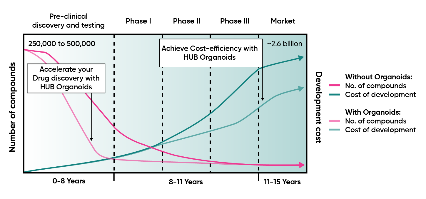 Portfolio-level costs (adjusting for ~10% success rate) without organoids ~$2.5 B and with organoids $1.8 B.