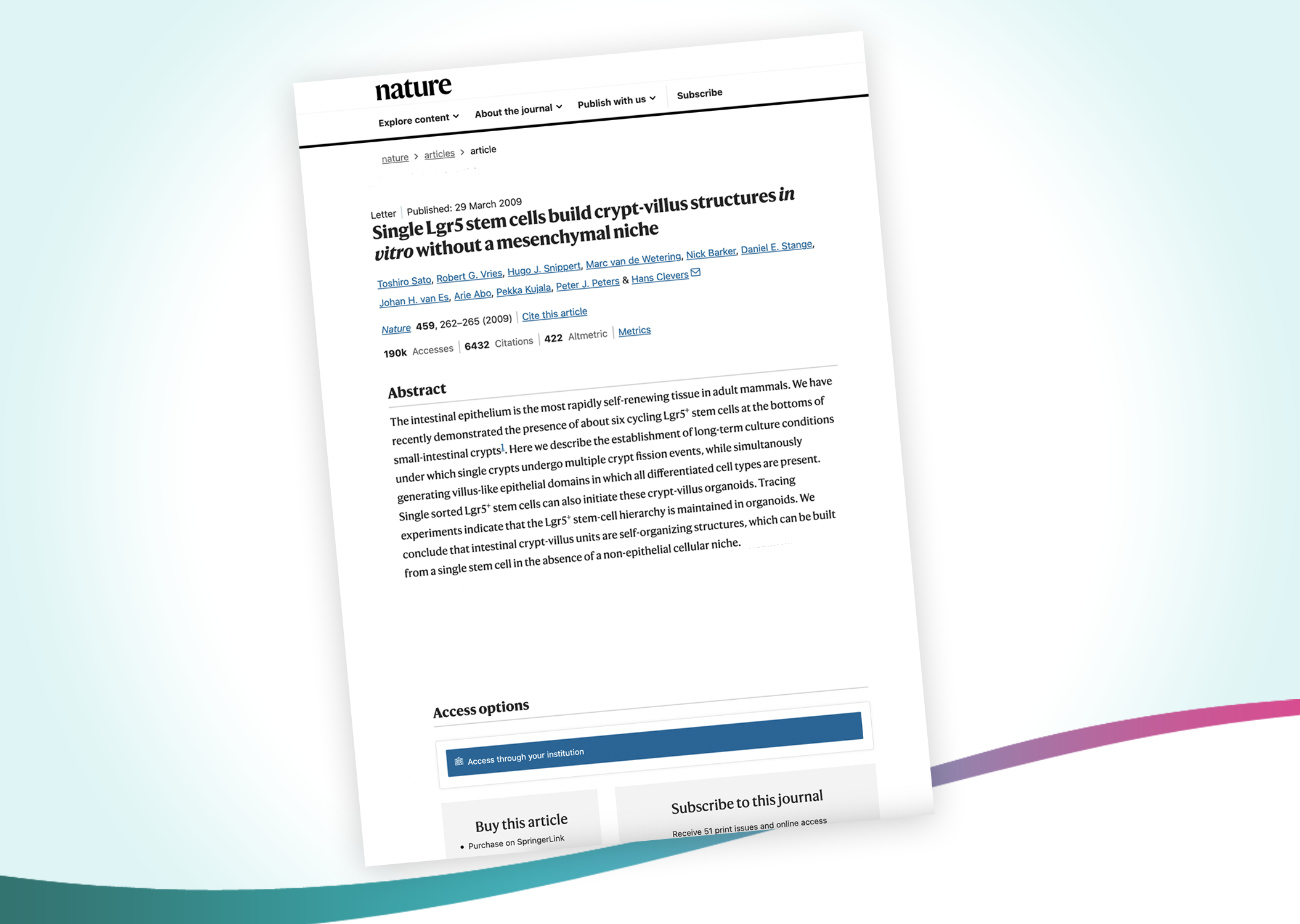 This episode draws from a 2009 Nature paper that revealed a groundbreaking discovery in stem-cell biology. The researchers showed that the intestine’s rapidly renewing lining can be rebuilt entirely from a single Lgr5-positive stem cell. In long-term 3D culture, individual intestinal crypts — or even single stem cells — grew into fully formed ‘organoids’ containing both crypt structures and villus-like regions with every major cell type. Importantly, these mini-intestines maintained the natural Lgr5(+) stem-cell hierarchy without needing any supporting niche cells. In short, the study demonstrated that the intestinal epithelium is a self-organizing system capable of regenerating complex architecture from one stem cell.